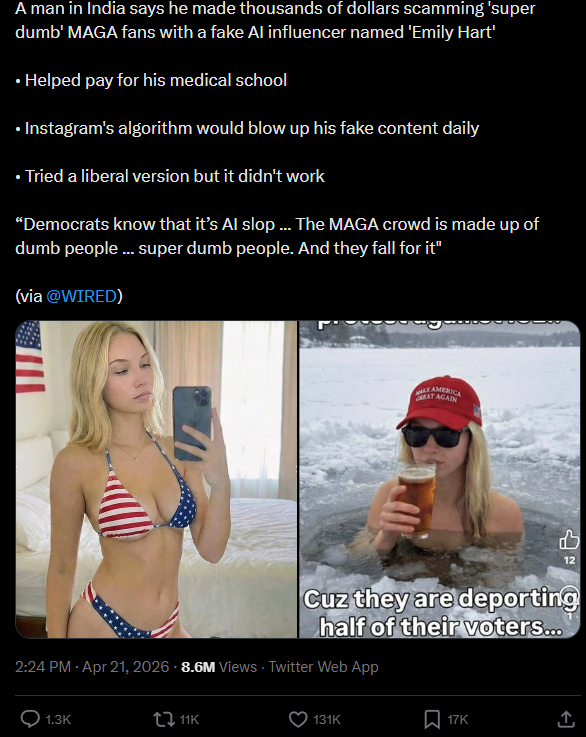 >>111264287Don't forget conservatives will throw their money at anything that looks remotely female because their brand is so toxic.I.E. there was just a story about how an Indian, yes that type, grifted MAGA men with an AI model that just repeated their ideology, and MAGA men just threw money at it.Even more funny, an AI told him specifically to target conservatives because they're such rubes, and the kicker, he tried a liberal version too, but that didn't take off at all.This is why you see a vast majority of political vtubers targeting election tourists, they're just insanely easy marks.