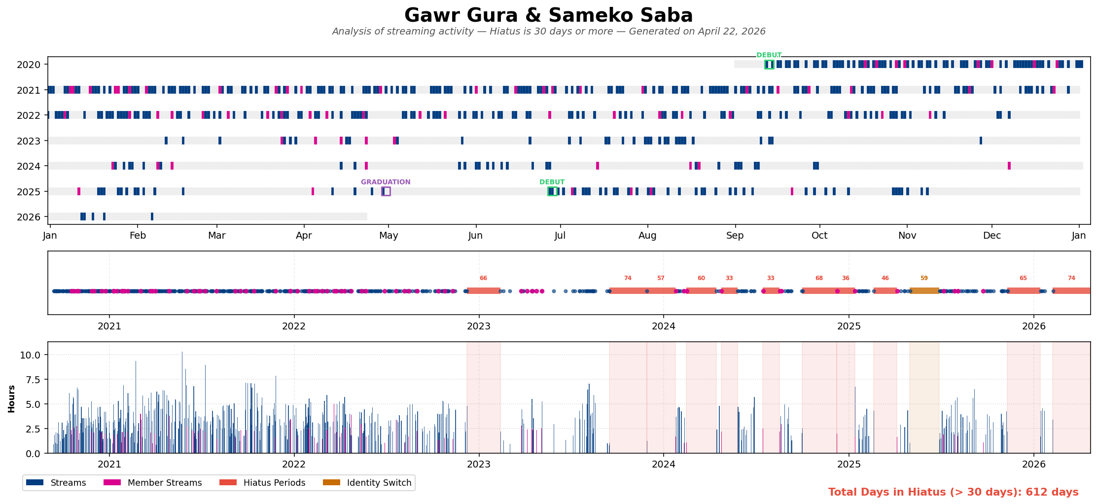all breaks over 30 days, MM/DD/YY>saba02/07/26 - ongoing (75d)11/09/25 - 01/13/26 (65d)>gura02/18/25 - 04/05/25 (75d)12/07/24 - 01/12/25 (36d)09/30/24 - 12/07/24 (68d) - ends with a single member stream, 104d combined07/14/24 - 08/16/24 (33d)04/23/24 - 05/26/24 (33d)02/18/24 - 04/14/24 (55d)09/14/23 - 11/28/23 (75d)12/08/22 - 02/12/23 (66d)