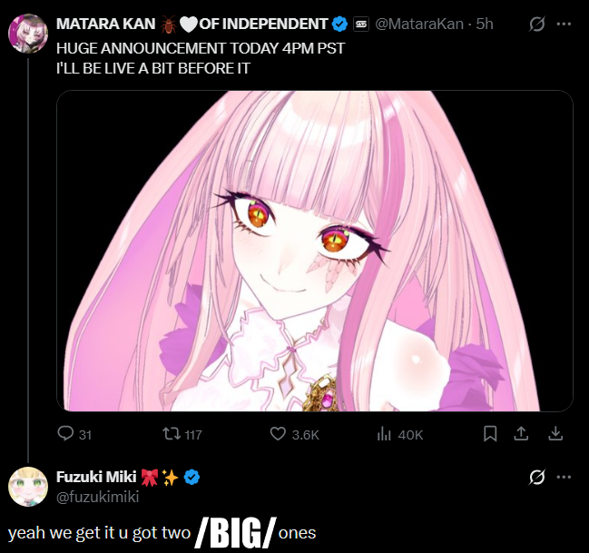 Birthday browsing Edition>What is /BIG/?/BIG/ is a thread to find, share, and discuss the biggest indie vtubers who have a 3-month average of 1000 viewers or more.>Can I shill my 999 CCV oshi here?No. 4views or higher only.>Live /BIG/shttps://vt.rita.moe/?tag=thread:/BIG/>Wordcloud creatorhttps://catalog.neet.tv/harlequin.html>/BIG/ logohttps://files.catbox.moe/jk4ric.png>Vod channelshttps://rentry.org/Indie_Vod_Archives_lig>Ferrets!https://www.twitch.tv/ferretsoftwareOther useful threads:>>>/vt//lig/>>>/vt//xvsj+/>>>/vt//swarm/>>>/vt//flip/>>>/vt//haha/>>>/vt//mint/Previous thread: >>111245774