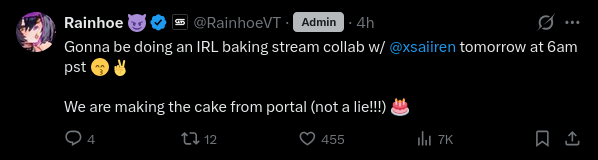 >>111298095Laimu's birthday is tomorrow, and she streamed on Monday, so she needed a rest day