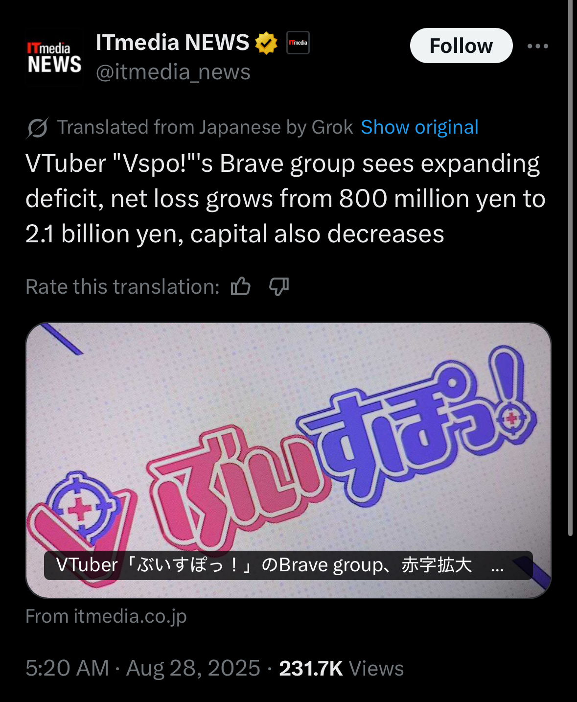 >>111292034>Brave's 3D lives have flopped>Ignoring JPV4Mirai and Chromashift are one things but VSPO! and Stellive (Neoporte as well) are pretty successful. Riot Music maybe in-between but definitely the JP side (KR I guess as well) is in a better situation than the EN side.