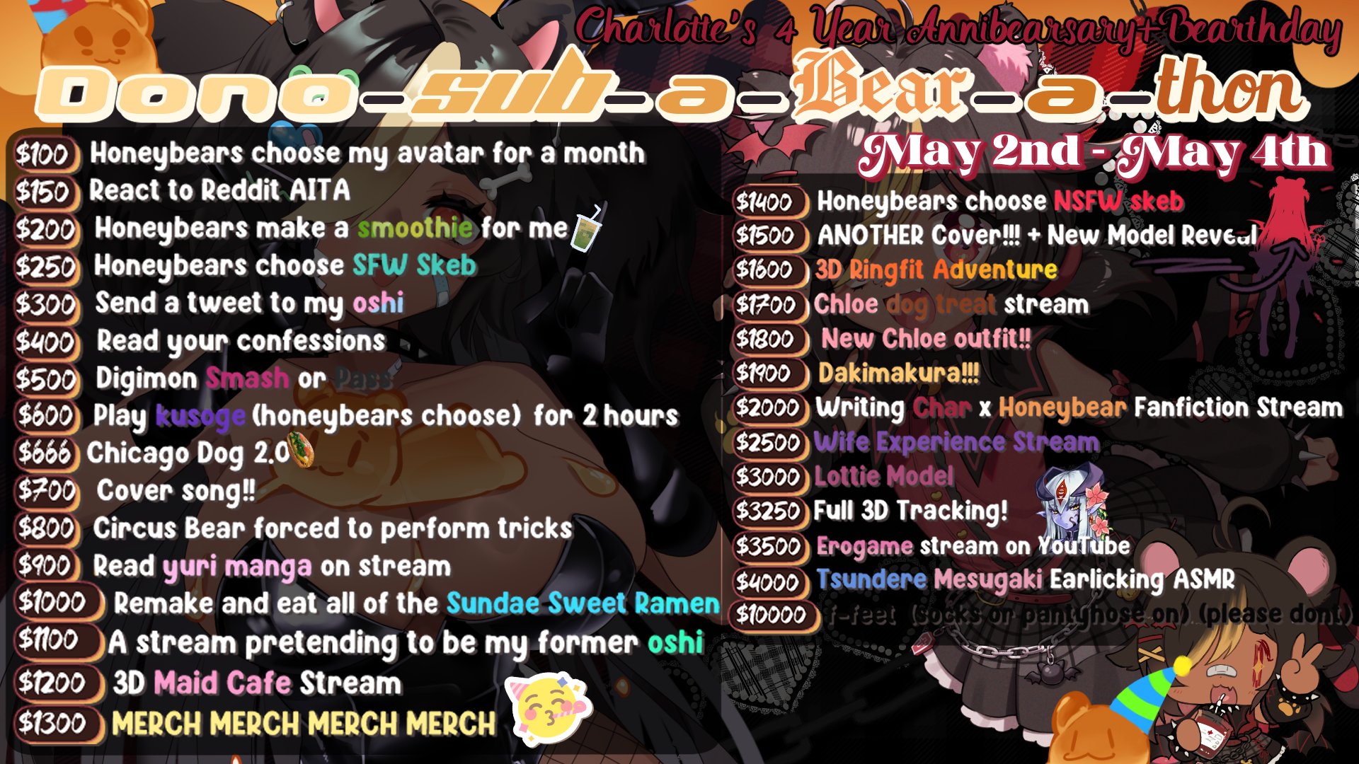 >>111410208I don't know if anon means the 3d would have been 10k or if the 3d and the merch pre-buy would have been 10k together. Typical functional 3d is a couple thousand, extra trackers is a few hundred, etc. The main tracking choice is a couple hundred to over 1k depending on the choice, but even a Vive or second hand Index isn't too bad these days. All of that does kinda add up. Hopefully she's more mindful of doing the math before putting it on a subathon goal board.