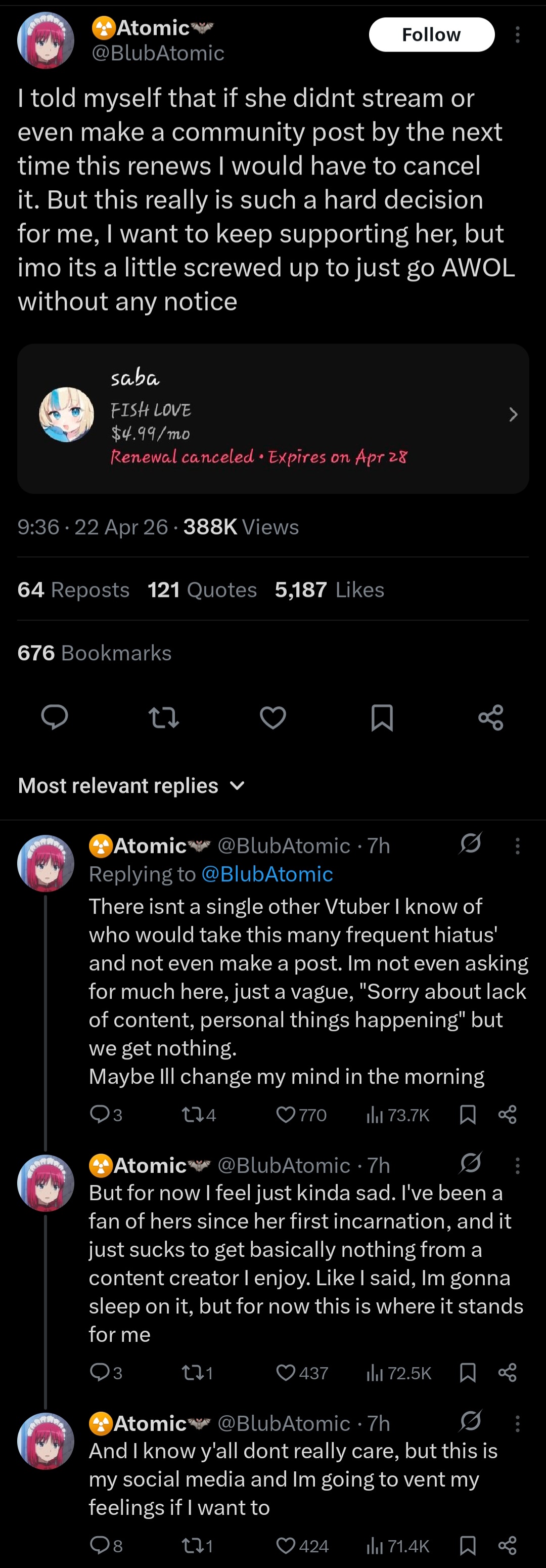 The last time I cancelled a payment to a creator I liked due to lack of content and literal radio silence it turned out his lengthy hiatus was because he hit someone with his car and had to deal with lots of court proceedings. It's not just health or boredom or menhera that could cause a content creator to drop from the face of the earth.