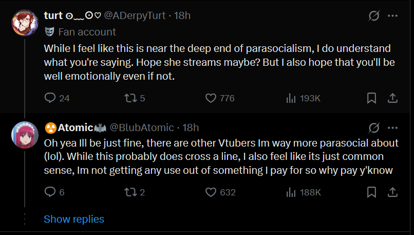 You ever just suddenly lose interest in vtubers for awhile? Like it hits you and you start thinking shit like, why am I even watching this? This random girl isn't my friend. She doesn't give a shit about me. What am I doing here? Does this even make me happy anymore? What do I still get out of this? And then you close the tab to watch anime or youtube or streaming service content slop for a little while before sheepishly clicking on the very same streamer you closed the day prior. Does that ever happen to you?