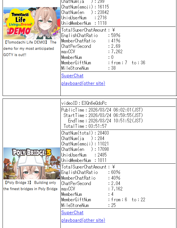 *GENERAL NUMBERFAG SITES*>https://playboard.co/en/>http://ikioi-ranking.com/>https://vrabi.net/>https://vtubertracker.info/en>https://live-ranking.userlocal.jp/vtuber-ranking>https://vstats.jp/Hololive sites>https://www.hololyzer.net/youtube/index.html>https://trackholo.live/en/>https://holo-spotify-stats.jirikunes.eu/>https://holo-tracker.vercel.app/>https://www.holostats.com/Twitch>https://sullygnome.com/>https://twitchtracker.com/>https://stats.roki.sh/>https://streamscharts.com/