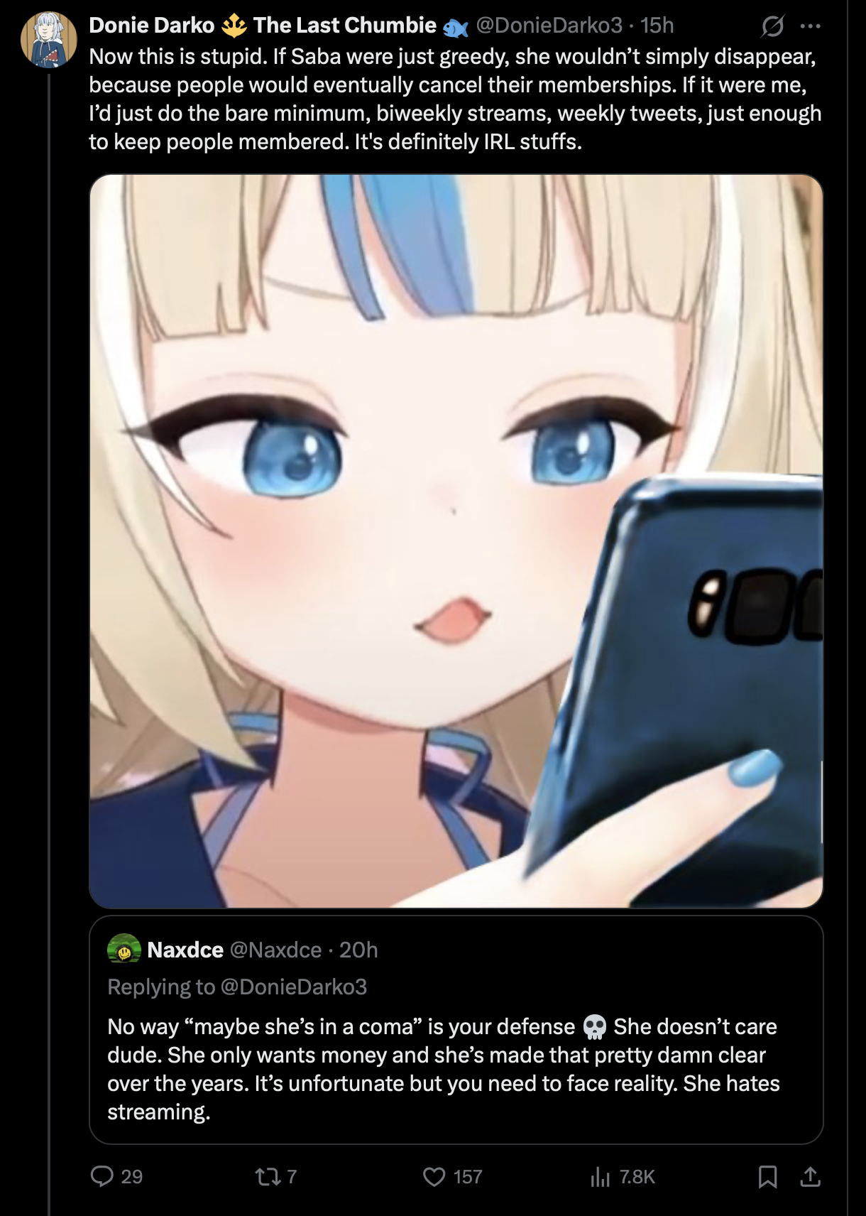 >>111311643>I remember seeing a chart that showed she was so low in donos and views, even certain homos beat herNot if you factor merch, they don't and, specially now, they don't anymore because they were cut off from that too
