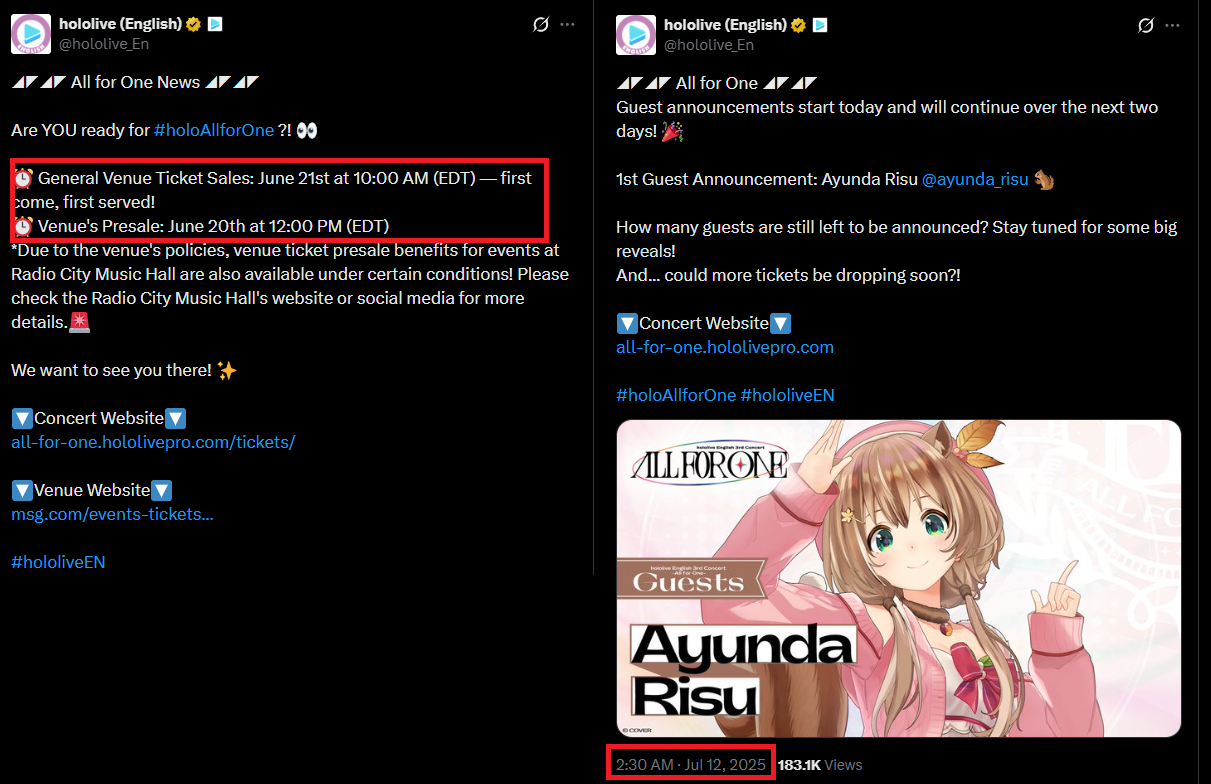 >>111311561>General Venue Ticket Sales: June 21st at 10:00 AM (EDT) >https://x.com/hololive_En/status/1943830165563297798why are you lying?