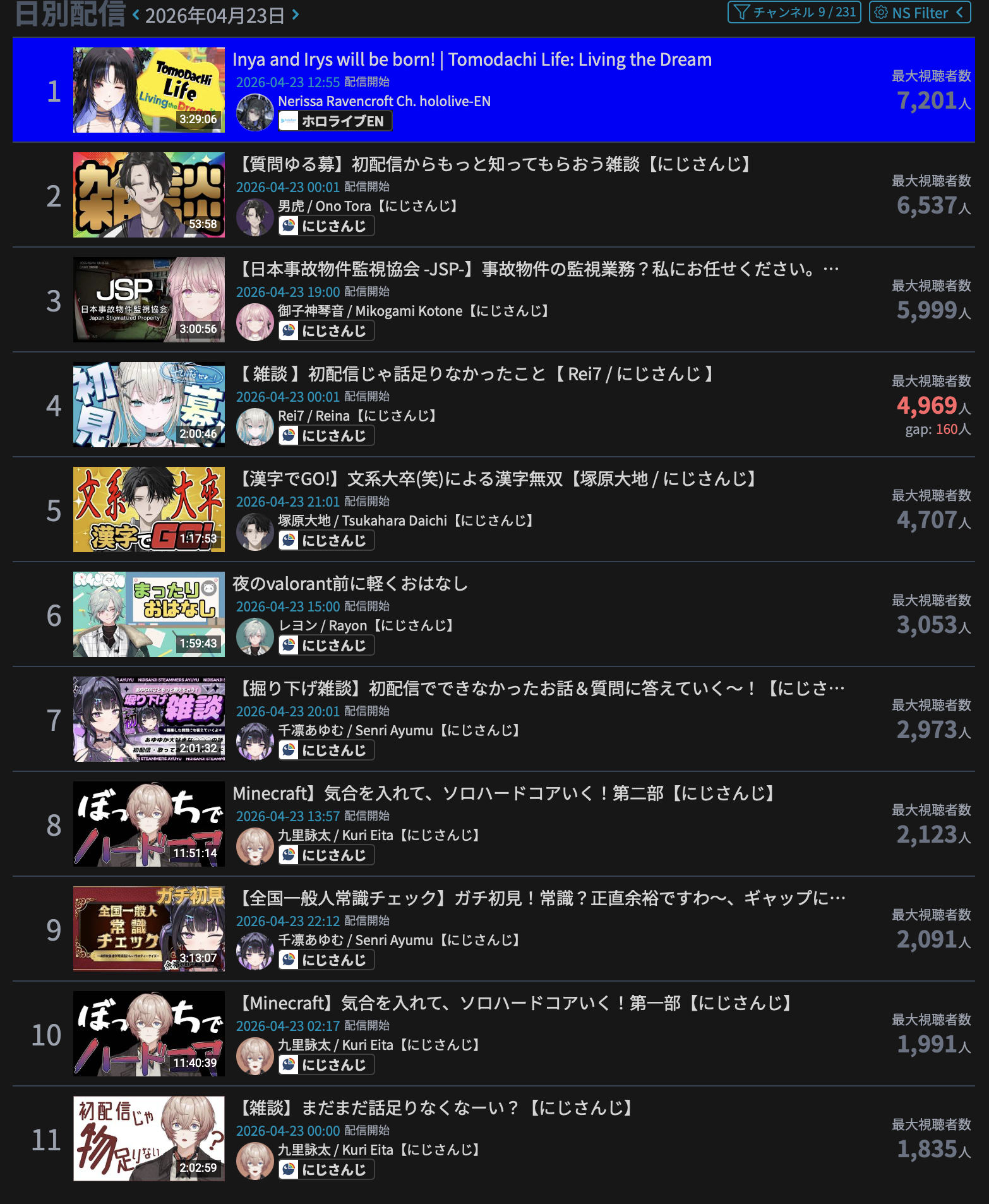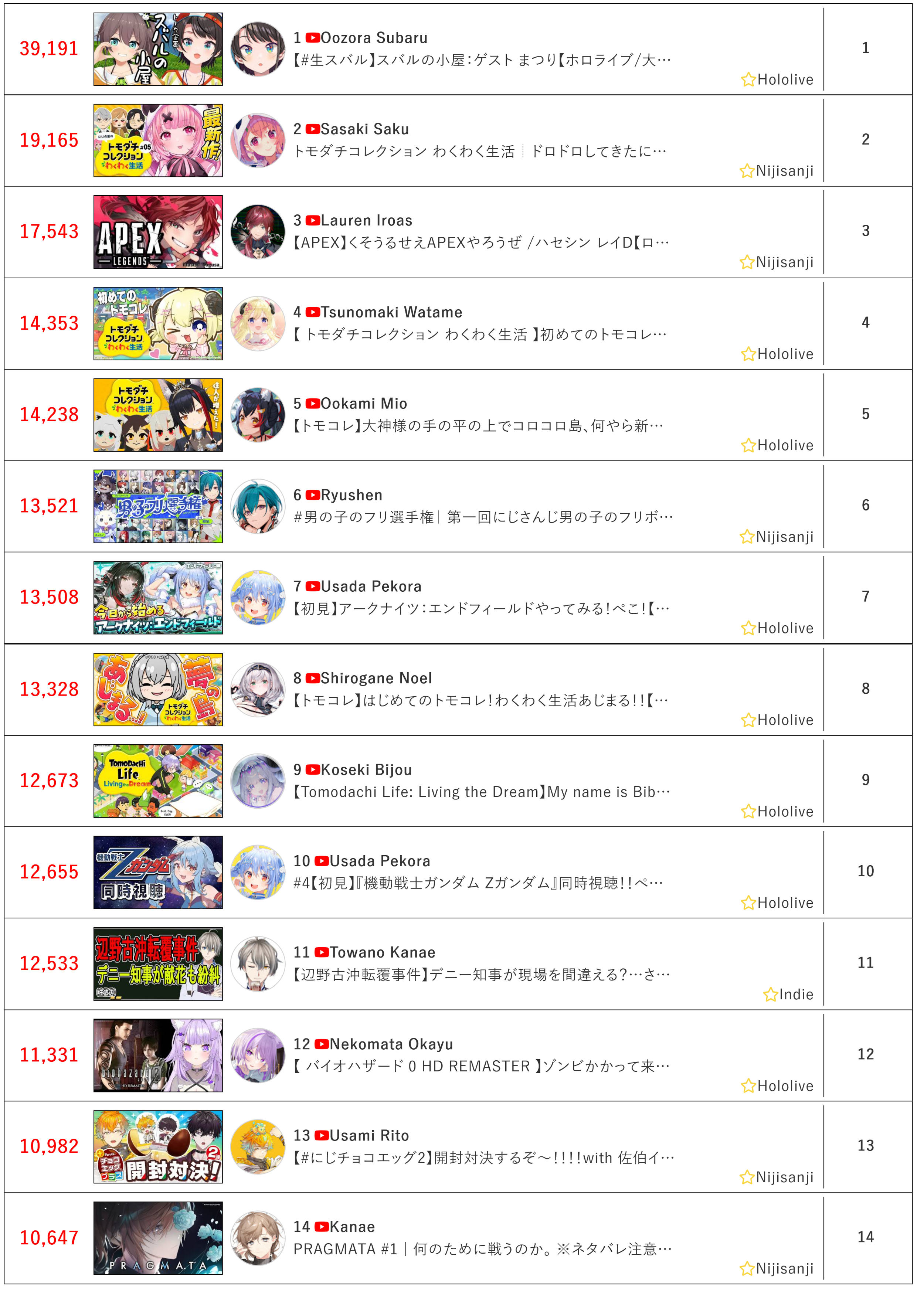 *GENERAL NUMBERFAG SITES*>https://playboard.co/en/>http://ikioi-ranking.com/>https://vrabi.net/>https://www.vstats.jp>https://live-ranking.userlocal.jp/vtuber-ranking>https://vt.poi.cat/Hololive sites>https://www.hololyzer.net/youtube/index.html>https://trackholo.live/en/>https://holo-spotify-stats.jirikunes.eu/Twitch sites>https://sullygnome.com/>https://twitchtracker.com/>https://stats.roki.sh/>https://streamscharts.com/