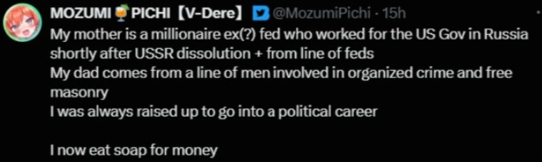 >>111361469I might be misremembering but... Wasn't this in response to that trend where people would post what they had achieved before becoming vtubers? It's kinda funny she couldn't come up with one personal achievement and instead went with HURR MY PARENTS