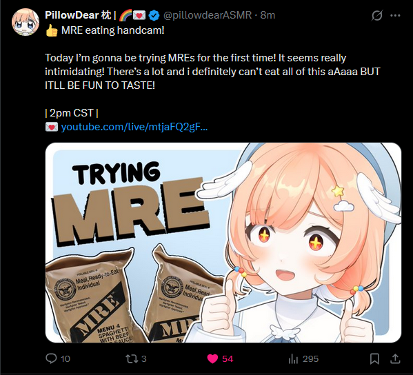 >>111362056>Thought our resident mentally ill clown would love it!Kek.Didn't know she had done a karaoke stream.>>111362249I don't get the point of these MRE streams. I have to watch it though, Pillow's hands are too cute.