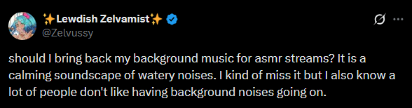 https://x.com/Zelvussy/status/2048060878227177622Zel I don't mind background ambiance but actual music would be distracting so I voted no