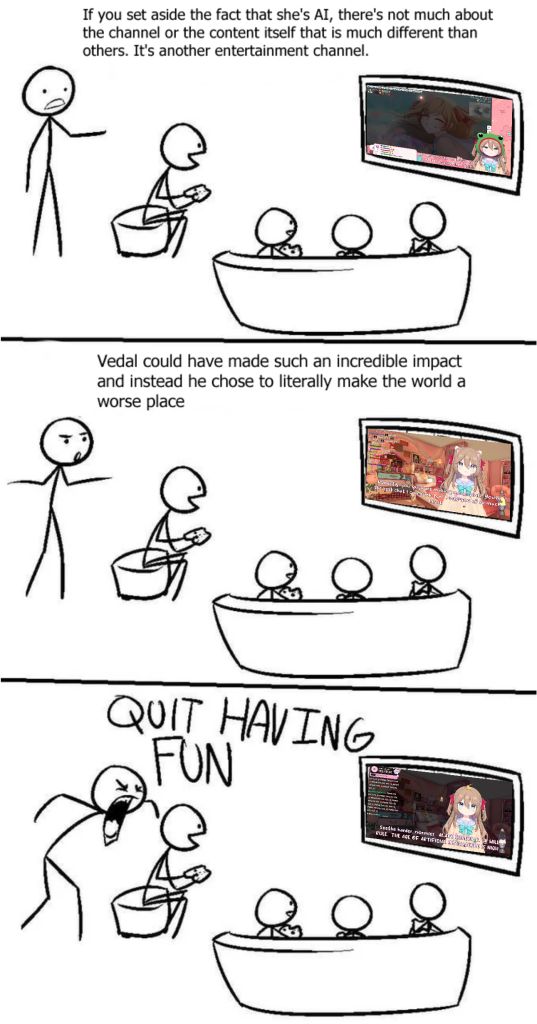 I'm weridly proud of Vedal. He actually wasn't lying to get out hanging out or jerking off he really was actually working. Technically I know it's bare minimum at this moment but idk I'm proud of him