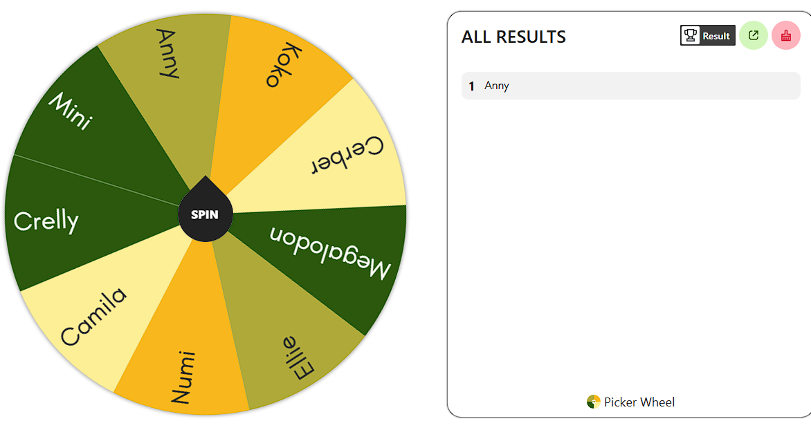 >>111388035https://pickerwheel.com/?id=SStYeThe wheel of winners.