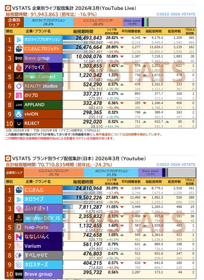 Vtubing corpo viewership for Q1 2026