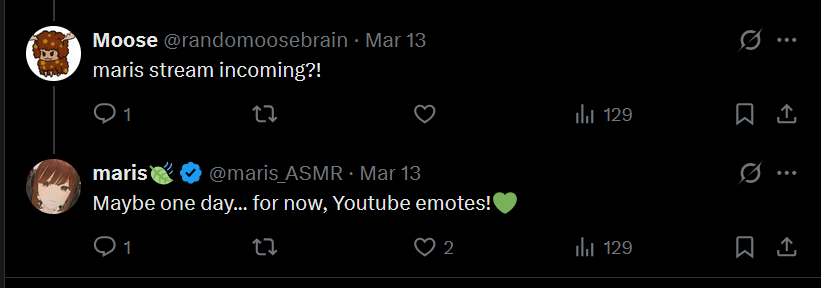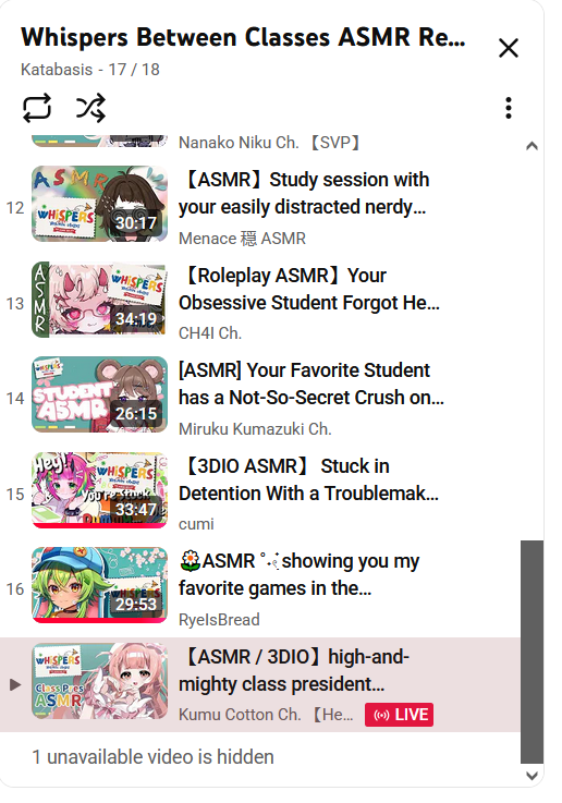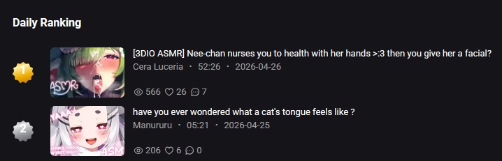 What/who did you listen to last night, tingles? Here's mine:• Yamiyami Spia (闇々すぴあ) - [2026-04-16] 【ASMR】ねぇ、負けるの・・・? 甘々敗北ASMR Sweet Defeat Whisper ASMR Ear Massage 広告なし ・ 魔王軍式 睡眠導入 #闇々すぴあ• Inanna Bell - [2025-05-21] - 【ASMR】loving fairy massages your ears inanna turned purple! • MeiwiBun - [2025-09-19] ꒰ live 3DIO ꒱ tingly ear rubs! kisses for followers/subs PARTNER PUSH• Sakura Uno (兎野さくら) [Kemomimi-Refle!] - [2024-12-29] - [ASMR] Shampoo and Massage• Ilu_Fluor (イル_フローラ) - [2022-10-18] 【ASMR】お耳のタッピング一時間Tapping only。睡眠導入、作業用。【#イル_フローラ⧸Vtuber】