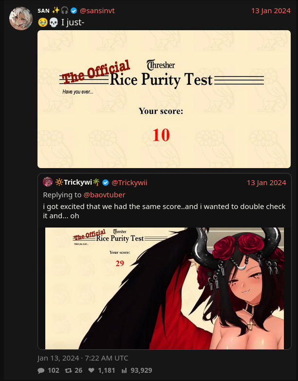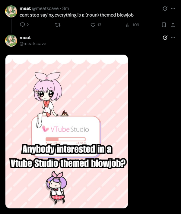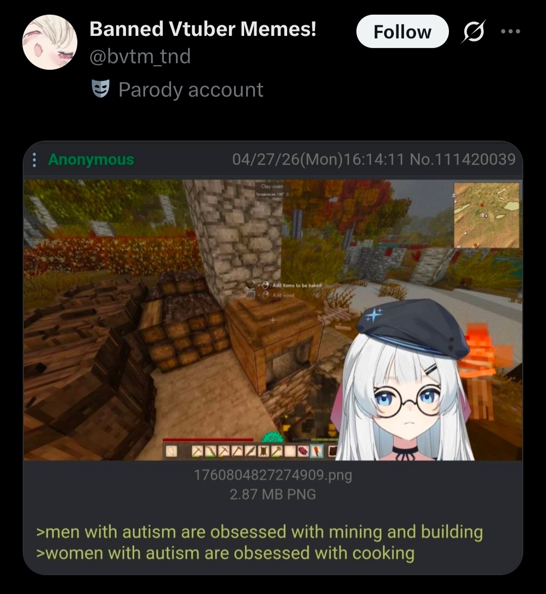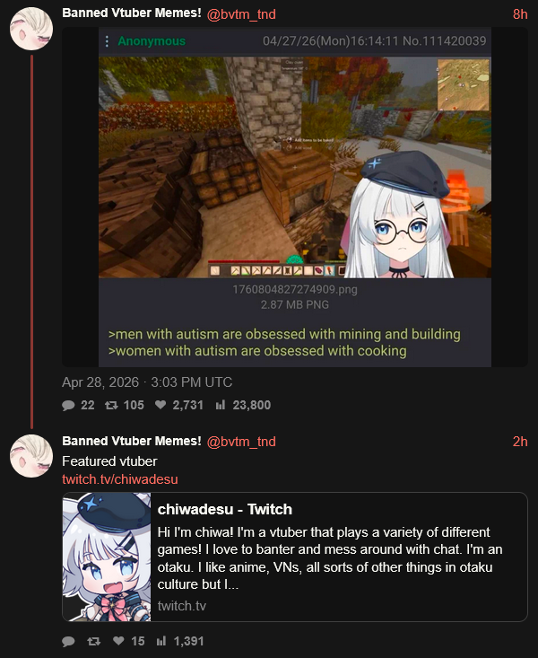 >>111447460>btvtm bad because... because he screencap le funi post and make tweethe makes his own posts (usually antiposts), screencaps those, and posts them. he fakes his content and does so to damage vtubers he doesn't like.