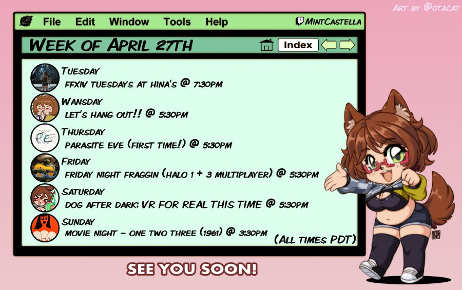 We need to cook Edition>What is /lig/?/lig/ is a thread for viewers to find, share, and discuss indie vtubers who have on average 500 viewers or more.>Why /lig/?Large indie vtubers have more net fans, but they are outnumbered by 2views by the thousands. This is a thread for the VIP, regardless of what language they stream on.>Can I shill my 499view oshi here?Considering averages fluctuate widely, all the way down to 100 is reasonable. The minimal requirement however is being Twitch partner or the YouTube equivalent in numbers.>Wait isn't that one a corpo?/lig/ is a thread for chuubas of a decent size who aren't defined by their corporate branding, either due to the small size of the corporation or the independence and lack of oversight granted to the talents>/lig/ Numbershttps://lignumbers.neocities.org/>Twitch Clips Guidehttps://pastelink.net/34vd5>VOD Archival Guidehttps://rentry.org/Vod_Archival_Guide>/lig/ VOD Archivehttps://rentry.org/Indie_Vod_Archives_lig_>Koikatsu cardshttps://mega.nz/folder/JYtkXJwL#07gAQCQqI_9FsmX9oQJKSA>/lig/ Wheel of Nameshttps://wheelofnames.com/5jh-93j>Tiermakerhttps://tiermaker.com/create/-lig--16586688-3>/lig/ Chuuba Birthday Calendar (WIP)https://www.canva.com/design/DAE-XgWodVg/ofLz4QC1yPPQ4T6TTAE0fw/edit?utm_content=DAE-XgWodVg>Upcoming BirthdaysMay 3rd - CharlottexBearMay 4th - Dya Rikku & ImakuniMay 6th - Nino EgynMay 14th - Peo YukinoshitaMay 17th - GrimmiMay 20th - ZentreyaMay 24th - FilianMay 29th - CottontailVAJune 1st - KyubaltJune 2nd - JuniperJune 4th - Anny>OC material for the OPhttps://mega.nz/folder/IIVD1IaJ#cfsRhWdJvzneIoG8HZUPuw>/lig/booruhttps://ligbooru.moe/>Ducks(embed) https://www.twitch.tv/dashducks (embed) (embed) (embed) (embed)Other useful threads:>>>/vt//big/>>>/vt//corpo/>>>/vt//choc/>>>/vt//flip/>>>/vt//haha/>>>/vt//indie/>>>/vt//mint/>>>/vt//swarm/>>>/vt//vrt/>>>/vt//xvsj+/Previous Thread: >>111439816