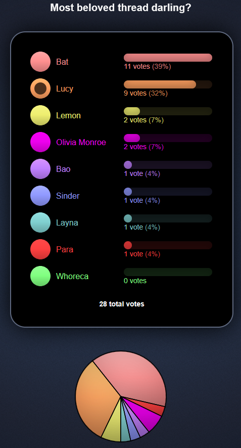 >>111467426if bat is the top answer in your poll that means everyone thinks it sucks and you should've had a "kill yourself" option instead