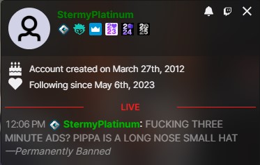 twitch chat culture is the worstLet's dissect the following specimens:>>111492016hateful stereotype which is a global tos violation>>111492628retarded unfunny spammer, nothing of value was lost