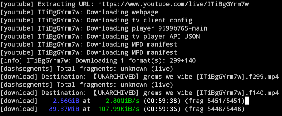 >>99258416ytarchive has never given me issues, except for member streams. I only use dlp for VODs