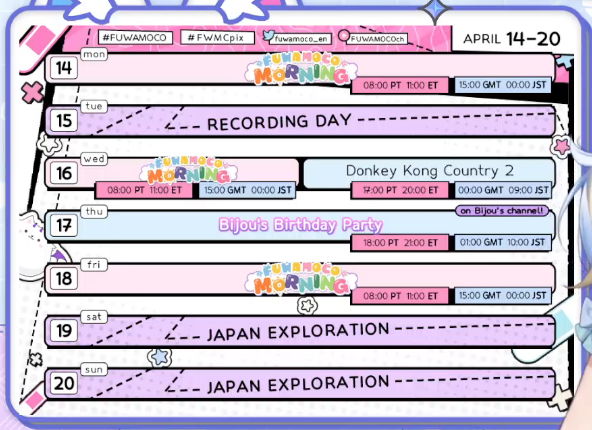 A different celebration event, 3D VR with an Archived and Unarchived part, will happen on the 14th (Official Biboo Tax Day), likely at the original times of 21:00 PST, 18:00 EST, 10:00 JST the following day.