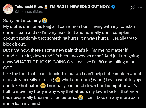 >>99346857I am often skeptical about vtubers but Kiara does have pain issues which she usually does her best to ignore. Back pain usually does get worse over time so this could be a serious issue for an idol in Hololive that does need to dance and it makes sense that she is worried. Cover wouldn't compromise with Fauna over mandatory paywall concerts which led to her graduation and Japanese corpos are ruthless.