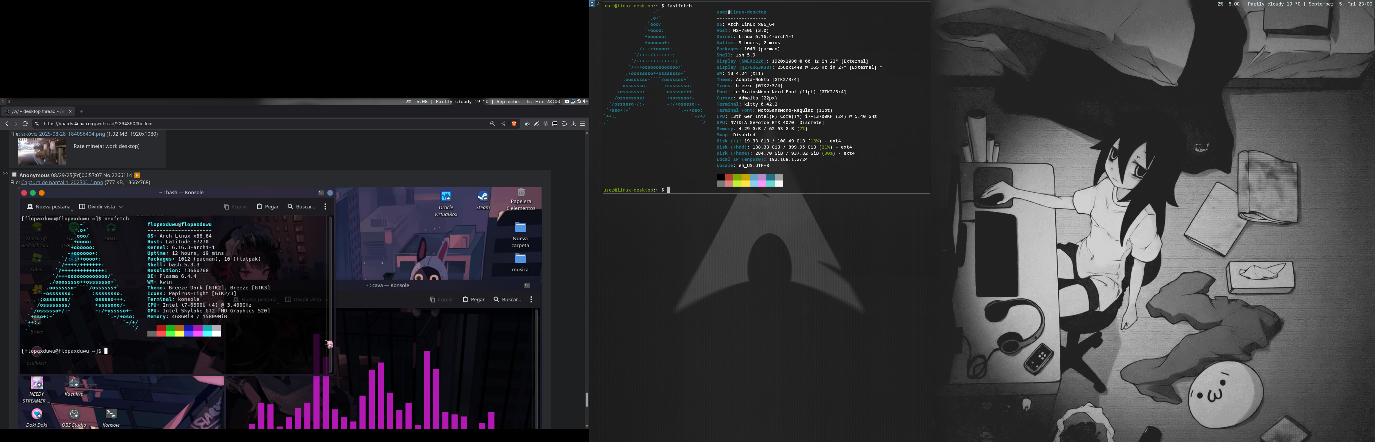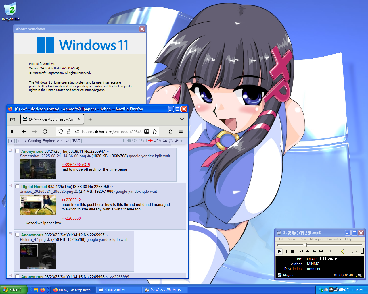 Found my mom's ancient laptop in the basement among a pile of old laptops that don't work anymore. So I tried to revive it. Loving Xfce4 so far.>>2265845There's something really comfy about this. Maybe it's the relatively small screen size/resolution combined with the colors.>>2265819>>2265433>>2265428>>2264881>>2264589 (based Shimeji Simulation bro)>>2264453>>2264425I love these.Btw, idk what it is but there's something really comfy about 1366x768