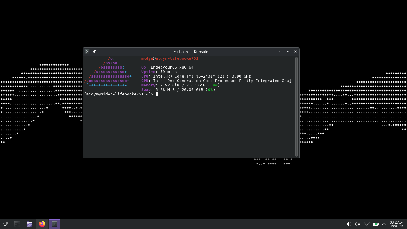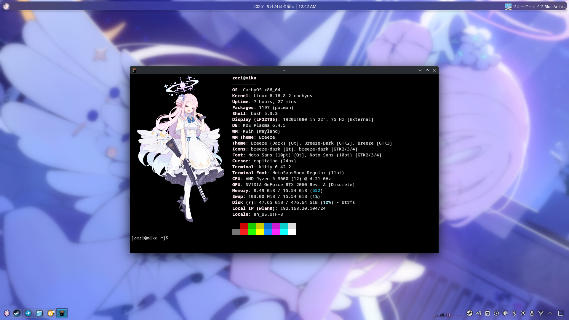 >>2264412My fastfetch? It's default actually. Once neofetch got archived and I switched I never got around to customizing it.When a new window opens my .bashrc displays the gif of the skeleton, then an "ls" command that uses exa for the folder icons. That's where the other stuff came from, then I just ran fastfetch at the endAlso, just realized I had no anime wallpaper in a /w/ thread -_______-