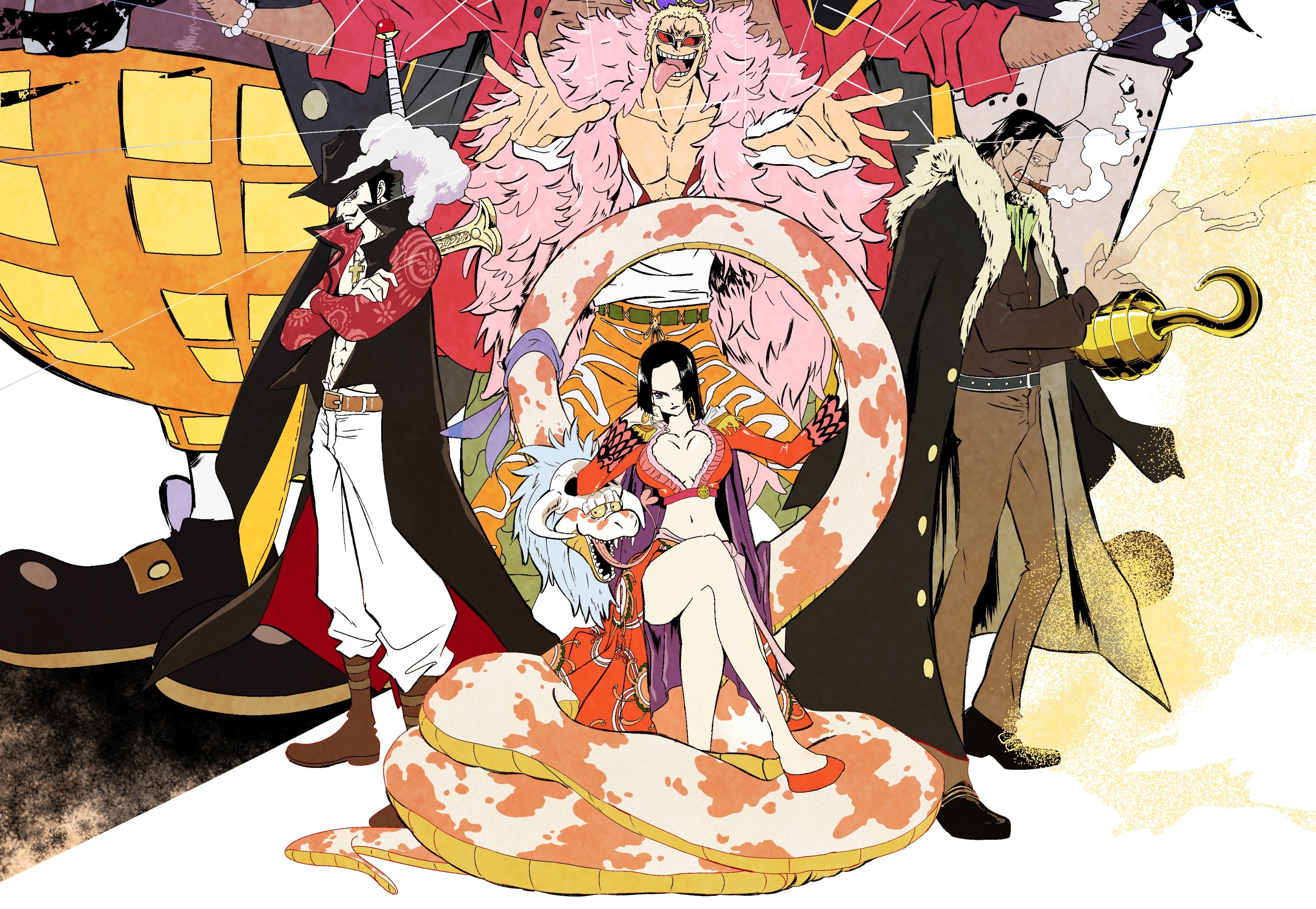 Please help to remove the background & Doflamingo, keeping Mihawk, Crocodile, & Hancock (and her snake) as they are.Thank you.
