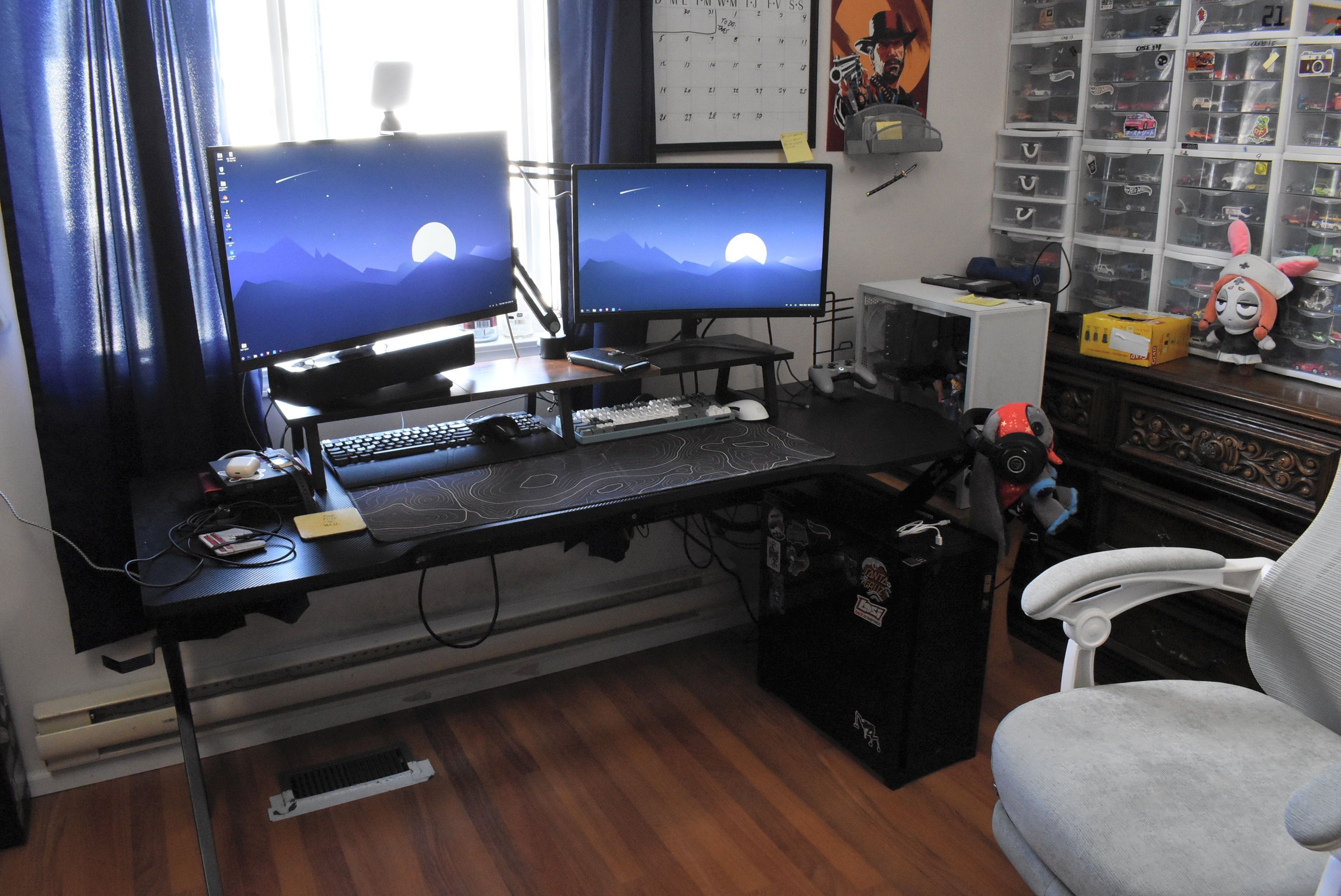 >>8131608Updated the setup, weeks ago, but recently (not pictured) is that I replaced the ol' floor lamp that was falling apart with a new wall lamp sitting above my curtains.