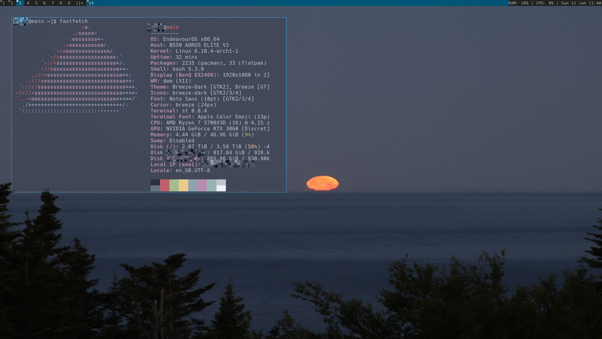 >>8106752colors are not cohesive, you have multiple shades of blue. typically you also want to avoid *fully* saturated colors. not like you can't have a bright rice but try to avoid like #00FF00 yannow. Otherwise you should pay attention to stroke widths because yours are all over the place. just making a font larger will also make it thicker, so look around for multi-weight fonts you can use to try to balance things out. that, and maybe find some icons that mesh with your vibe a little better, your weather and wireless/audio icons are gratingly different. also, you're having legibility issues on your wifi and highlighted date cause you're too saturated on your FG and too bright on your BG. get a backdrop under the calendar or choose your colors better. the "activate arch" is cute tho4/10 you're getting there>>8106764legitimately melancholic i love this>>8109838now that's a damn personal computer>>8112080step 1 is making all your palettes and fonts match. your terminal, music player, and broswer are all doing their own shit. custom CSS for 4chan if you have to, and hide those ugly browser icons or replace them with something that matches the native browser theme. you could also use some padding and a real color scheme. don't use #00FF00 unless you're going all in on a tty vibe imo4/10Comment too long. Click here to view the full text.