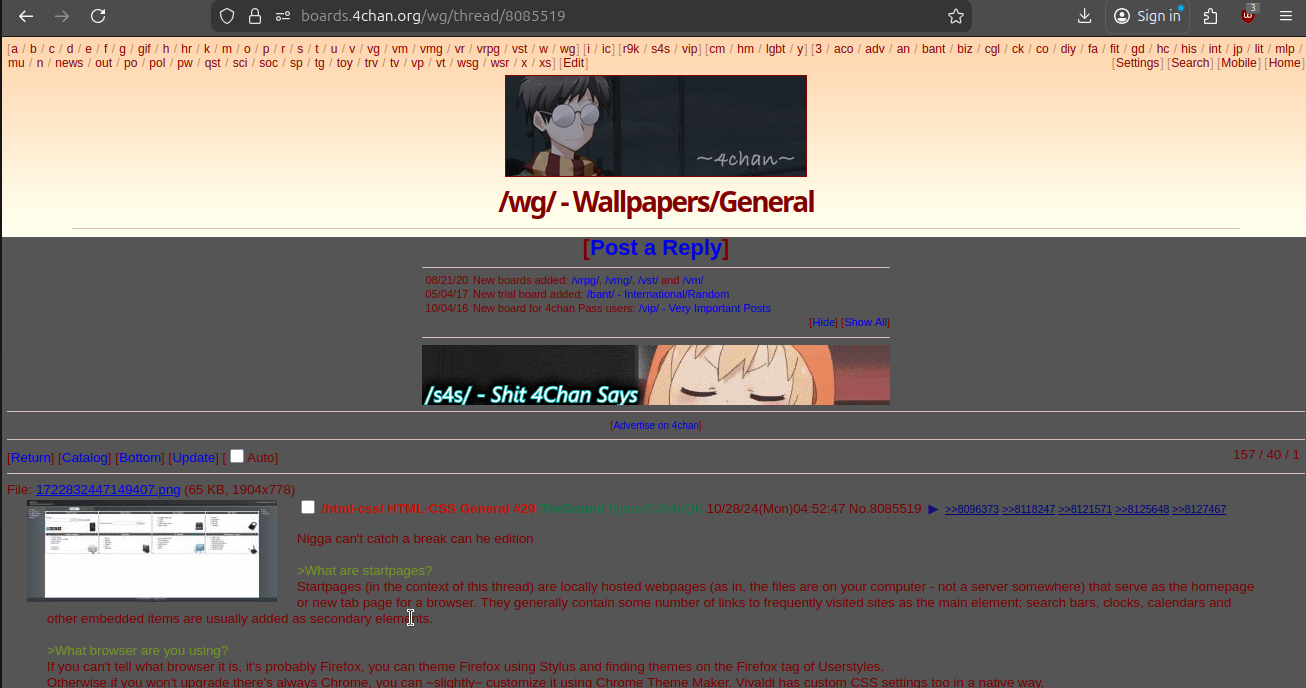 Nigga can't catch a break can he edition>What are startpages?Startpages (in the context of this thread) are locally hosted webpages (as in, the files are on your computer - not a server somewhere) that serve as the homepage or new tab page for a browser. They generally contain some number of links to frequently visited sites as the main element; search bars, clocks, calendars and other embedded items are usually added as secondary elements.>What browser are you using?If you can't tell what browser it is, it's probably Firefox, you can theme Firefox using Stylus and finding themes on the Firefox tag of Userstyles.Otherwise if you won't upgrade there's always Chrome, you can ~slightly~ customize it using Chrome Theme Maker. Vivaldi has custom CSS settings too in a native way.---FAQ--->http://pastebin.com/PdPrW5aP (embed)---Discord link--->https://discord.gg/ExAGgVRComment too long. Click here to view the full text.