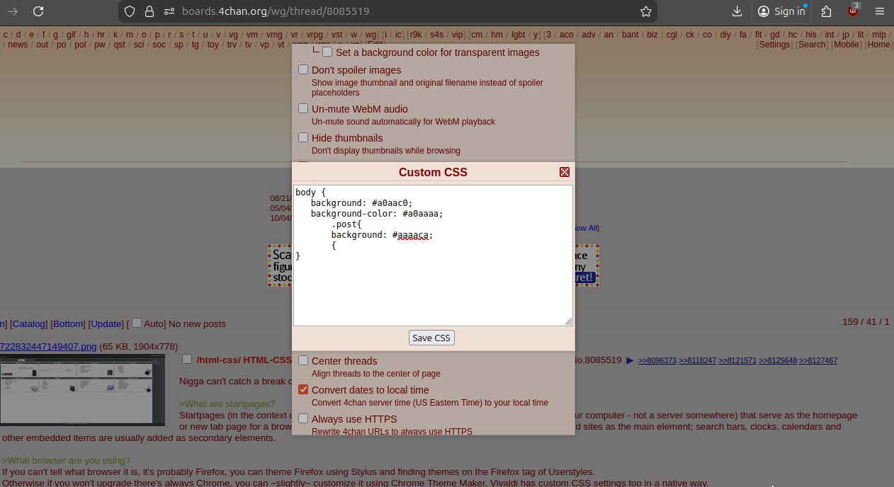 >>8133219>>8133153here's minebody{background-image: url("https://encrypted-tbn0.gstatic.com/images?q=tbn:ANd9GcTOw_jL-P4gdioYJ_wQtJ6HCHDTAVnkXop4Vg&s");background-size:100%;background-attachment:fixed;background-repeat:repeat;color:red;}.thread{filter:opacity(0.1)}