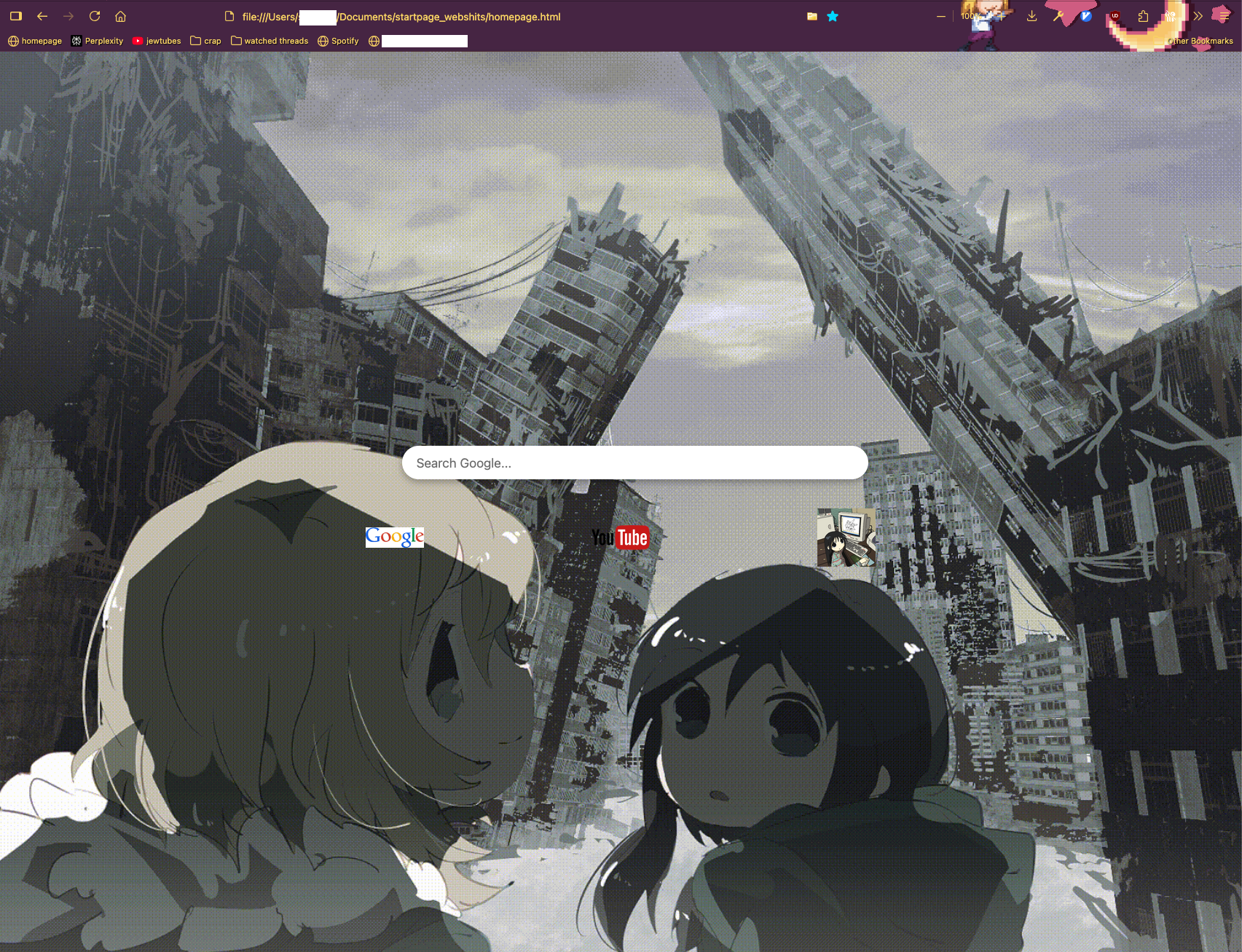 >>8095465There has been a guide for it on the OP links for god knows how long: https://stpg-tk.netlify.app/guides/firefox-startpage/Which funnily enough is obsolete as of the last Firefox update (136). To fix it you have to change your .cfg to this: // Any comment. You must start the file with a single-line comment! let {classes:Cc,interfaces:Ci,utils:Cu} = Components; /* set new tab page */ try { ChromeUtils.defineESModuleGetters(this, { AboutNewTab: "resource:///modules/AboutNewTab.sys.mjs", HomePage: "resource:///modules/HomePage.jsm", }); let newTabURL = "file:///C:/Users/Usuario/Documents/Startpages/u0/index.html"; // For new tabs. AboutNewTab.newTabURL = newTabURL; // For home and new windows. HomePage.safeSet(newTabURL); } catch(e){Cu.reportError(e);} // report errors in the Browser Console