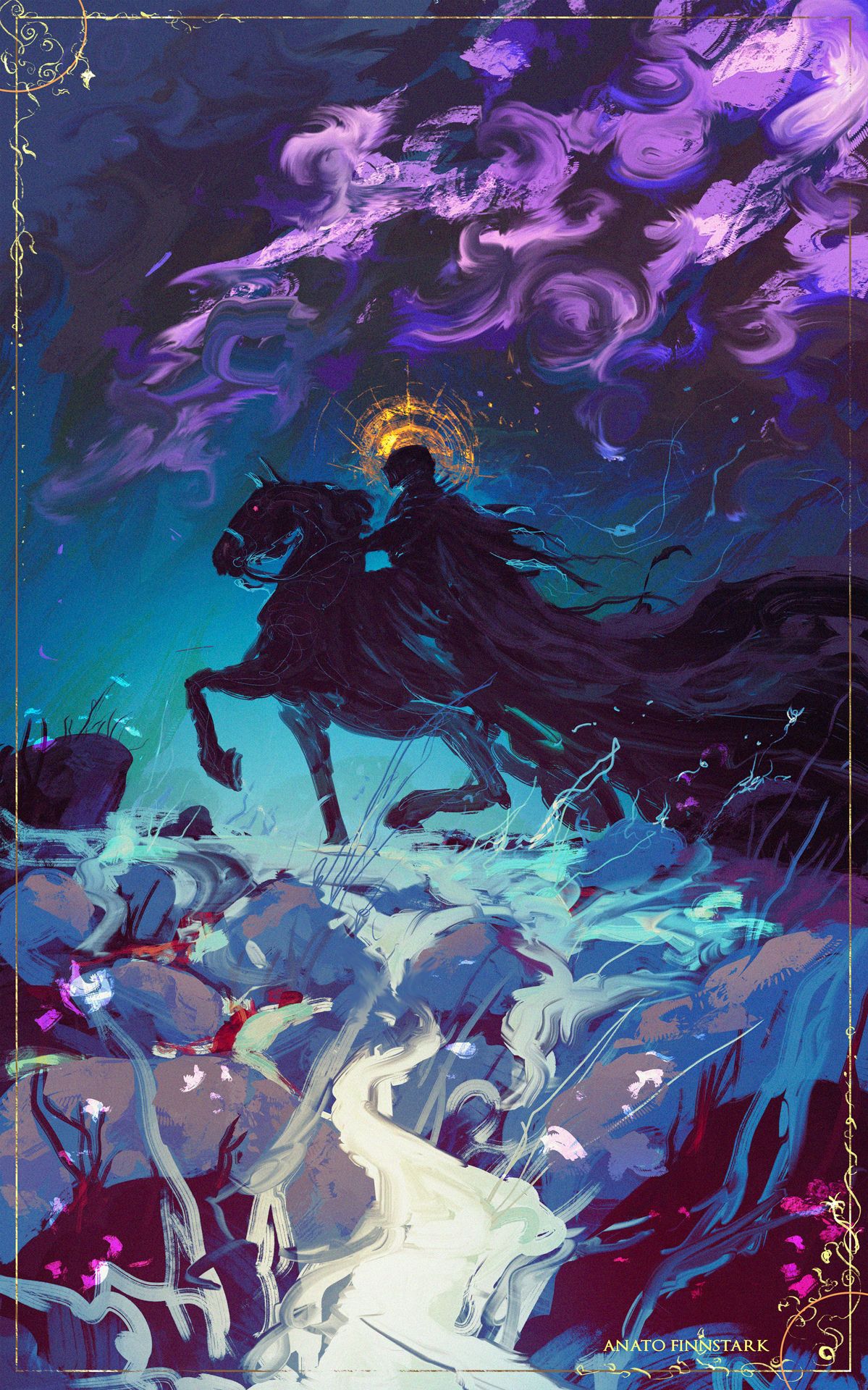 Request to change the horse's eye color to the colors of the purple mist going above the knight.