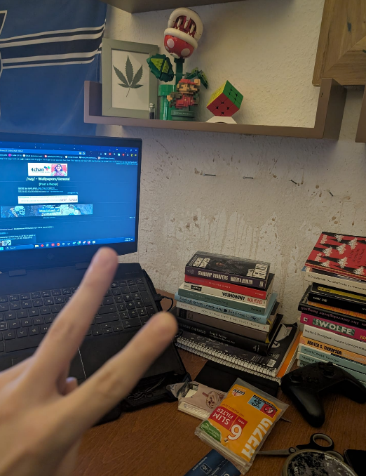 Der Monitor ist weit weg weil er eigentlich ein 14 Jahre alter Fernseher ist welchen ich jetzt als Hauptbildschirm für meinen Laptop benurze. Da es halt nh Fernseher und kein PC Monitor ist schieb ich mein tisch immer nh ticken nach hinten damit er von der Perspektive her wie ein normal großer Computer Bildschirm wirkt.