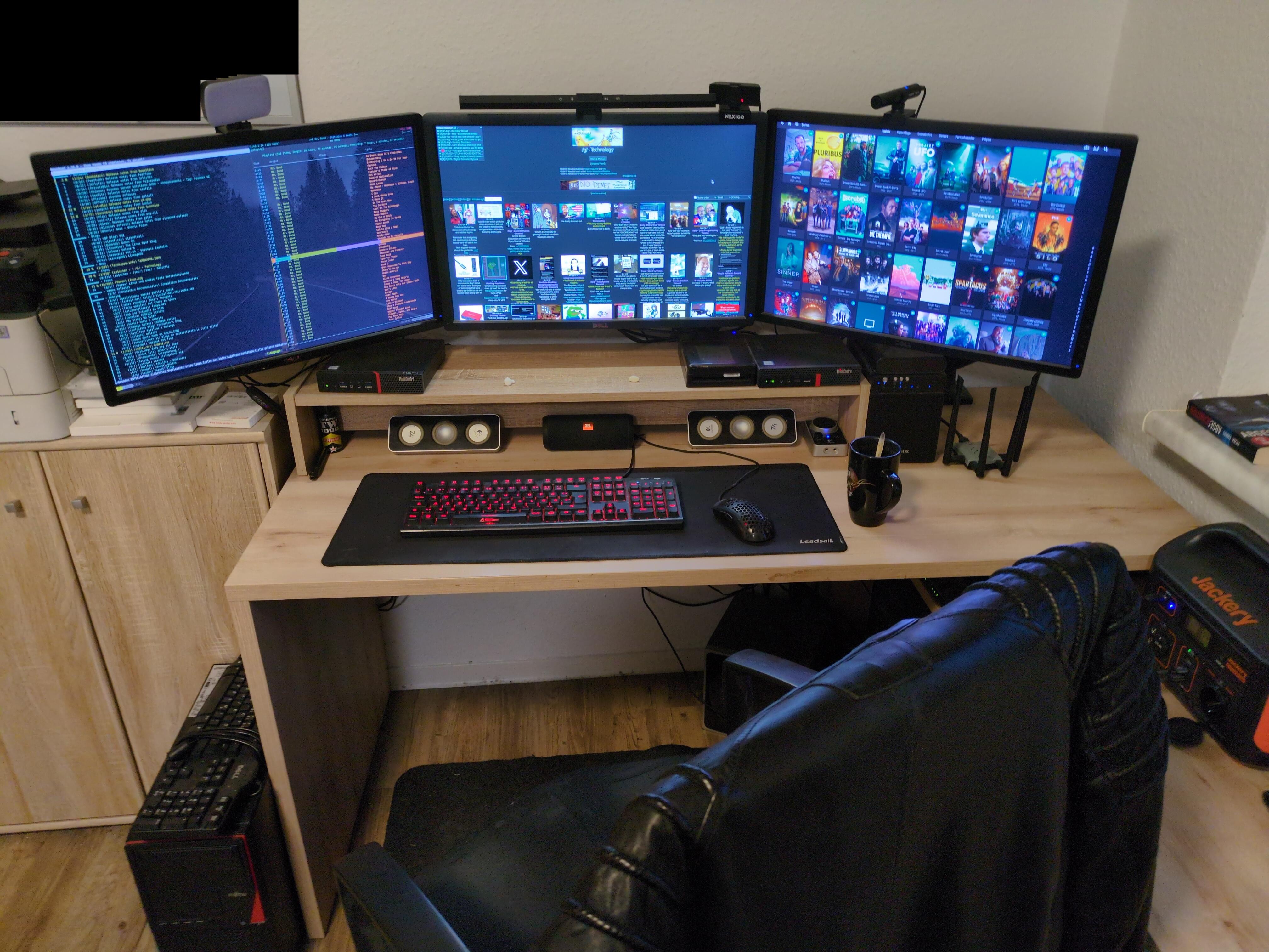 Rearranged the setup the other day. Still not 100% satisfied because of the cables (especially lengths), but at least the left monitor is the big one.