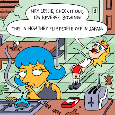 It's a single panel of two women drawn in crude cartoon artstyle. They are standing in the kitchen and one is flipping back and saying something like "look, this is how they flip people off in japan" while the other says nothing and turns on a cigarette on the stovetop.