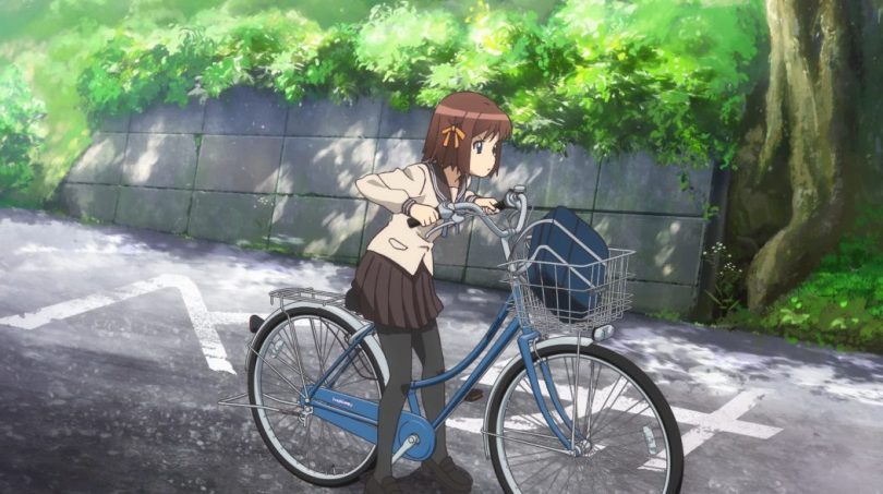 I'm looking for an anime scene where a girl helps a child cross the street and risks being late because of it.After that she gets on the back seat of a bicycle.