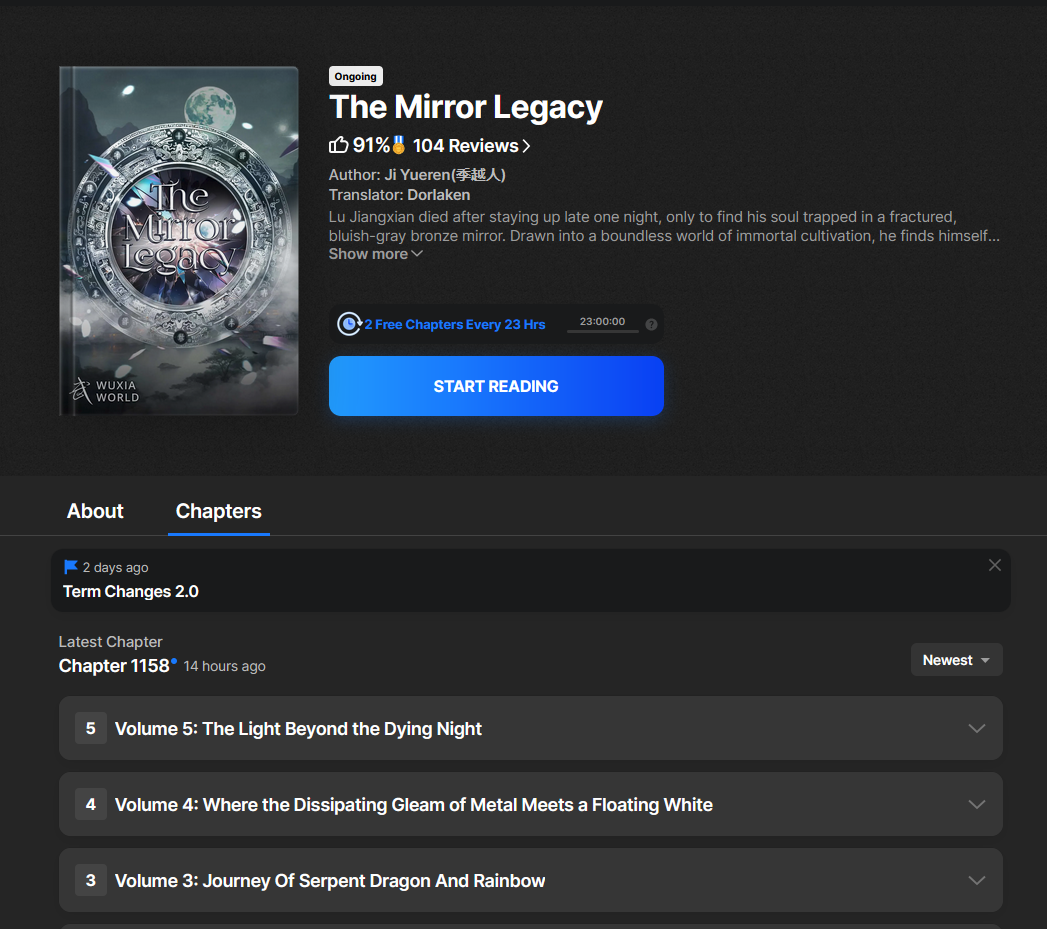 /r/ing an epub download of this webnovel. couldn't find it on anna's archive or mobilismof course it's still ongoing but the first 4 volumes would be nice. https://www.wuxiaworld.com/novel/the-mirror-legacy