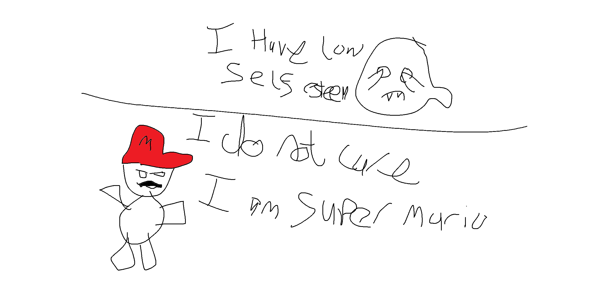 I am looking for a miiverse post with someone saying "I have low self esteem" with a reply being a drawing of Mario saying "I do not care, I am super mario" pls I have been looking for months.I recreated it on paint lole