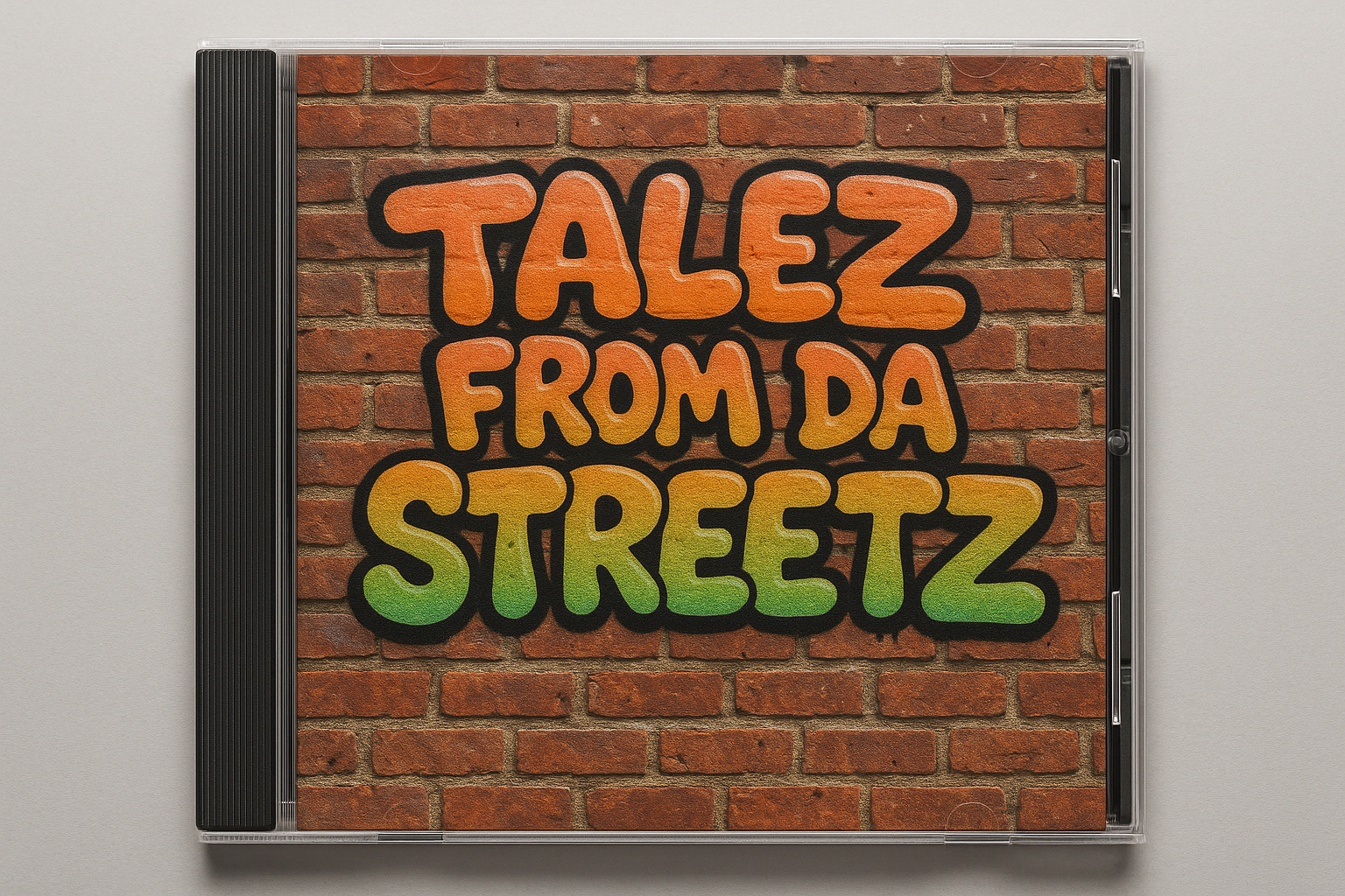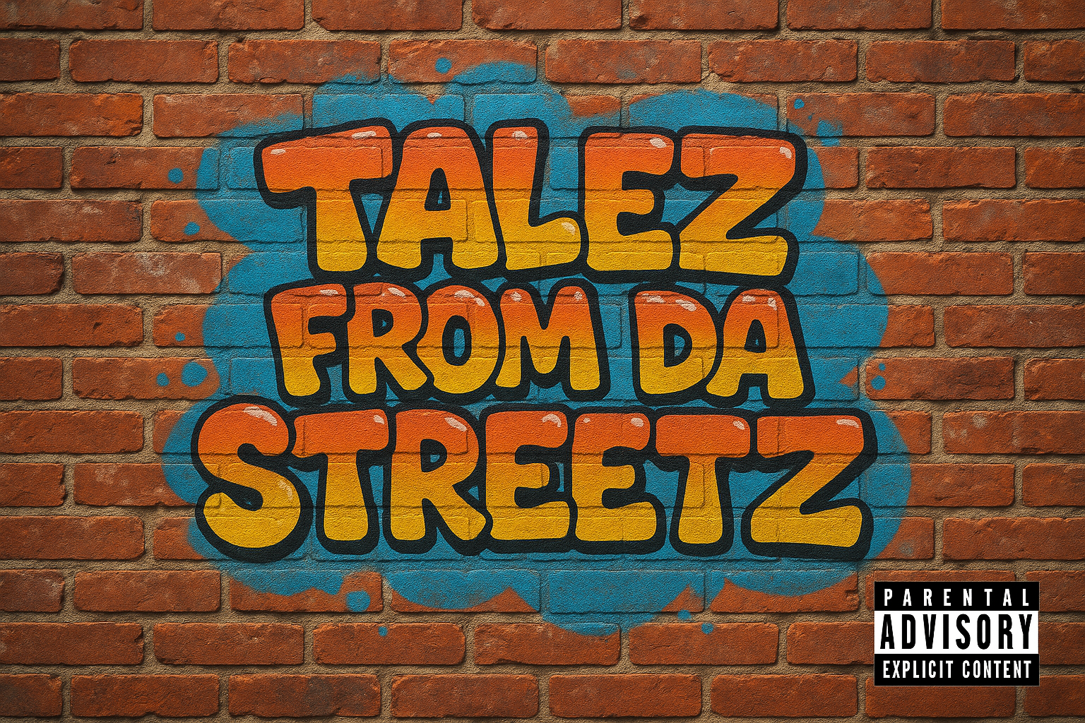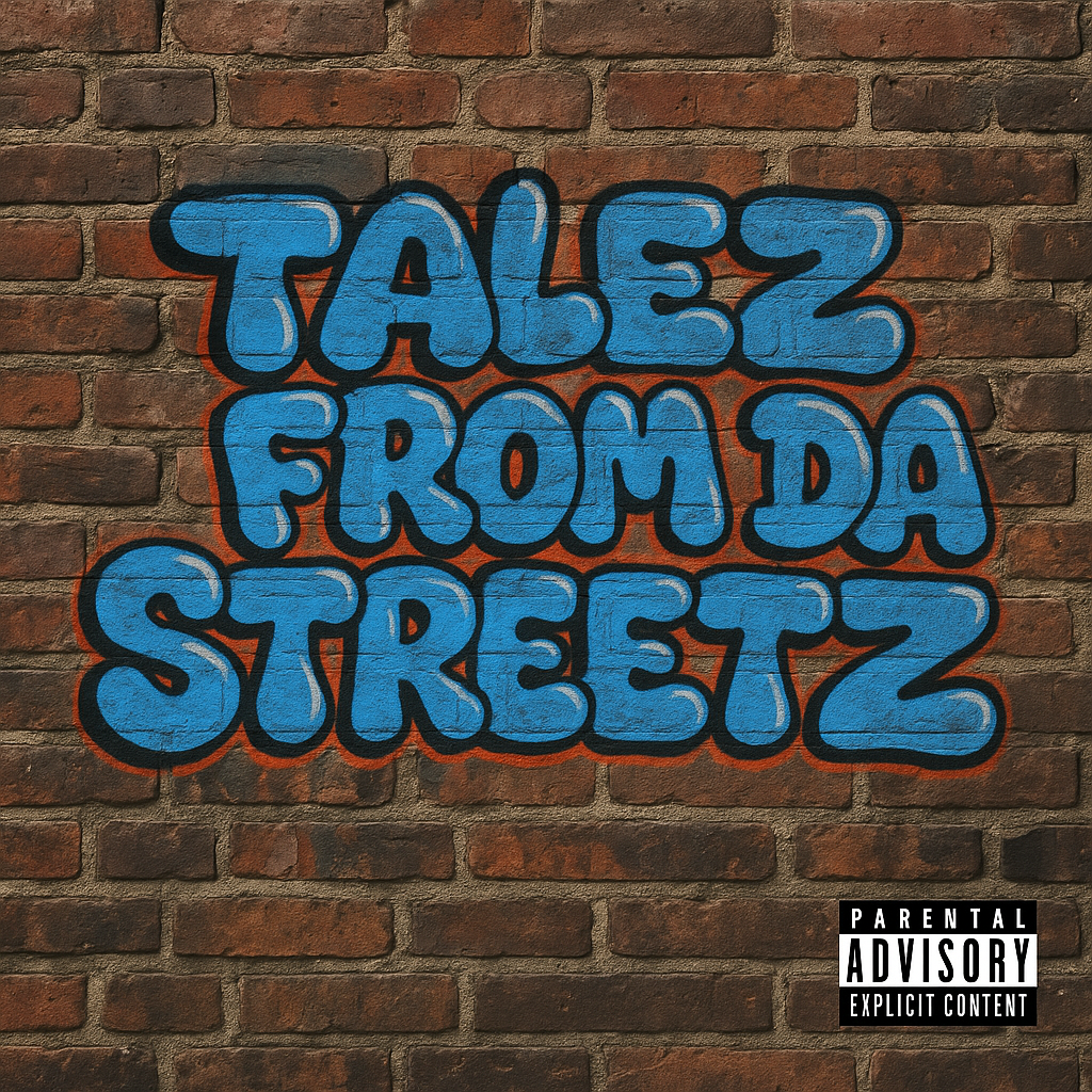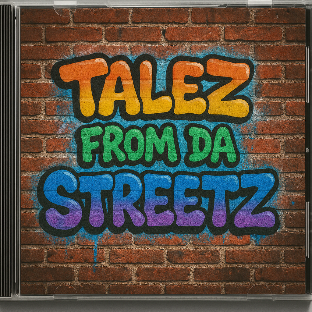 I have a request please for an AI image. The image must be in the format/dimensions of an album cover. It's a photorealistic depiction of a brick wall in an american hood. There is graffiti bubble writing on the wall. The text says: Talez From Da Streetz.Thank you.