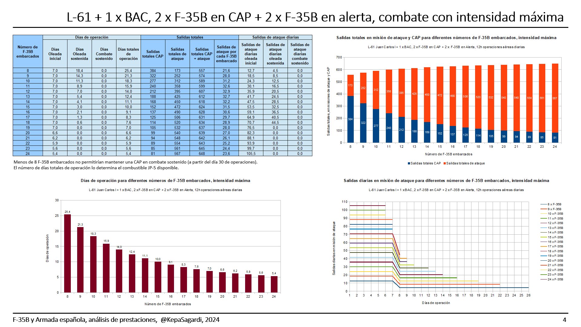 >salidas totales en mision de atque y CAP para diferentes numeros de F-35B embarcados, intensidad maxima