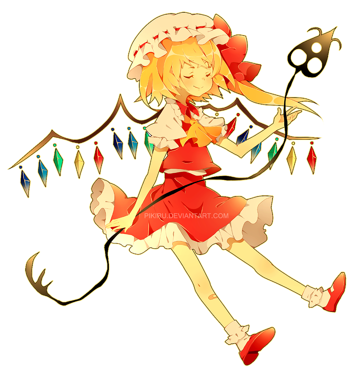 Hey !Between 2009 and 2011 I was super into Touhou, and especially EoSD. Some time ago, I remembered I had a Flandre Scarlet pfp on Facebook. The thing is I deleted this account since, and I no longer have access to the pic. I searched on differents booru, but never found this particular fanart.The picture is a solo image of Flandre, full body turned 3/4, smiling, looking at viewer in a white background. She is holding behing her Lævateinn, wore her typical red attire, with no sock on red shoes. That's basically what I can recall.I know there's a LOT of Flandre Scarlet stuff on here lol so I don't have alot of hope, but never say never I guess, so I throw this bottle at the sea.