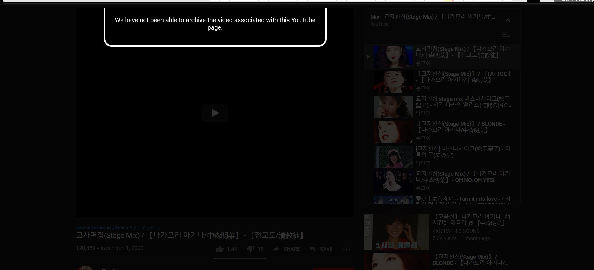 At this point I think my only hope is that somewhere in this world someone downloaded Akina Nakamori stage mixes OFF of youtube from that channel, and they are sitting on their computer somwhere. I would have to, by some unlikely chance, come into contact with whoever may have done so.
