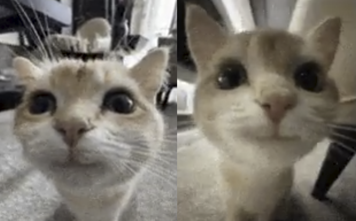 Sure it's the same cat? The right one has a white strip running up from its nose past its right eye