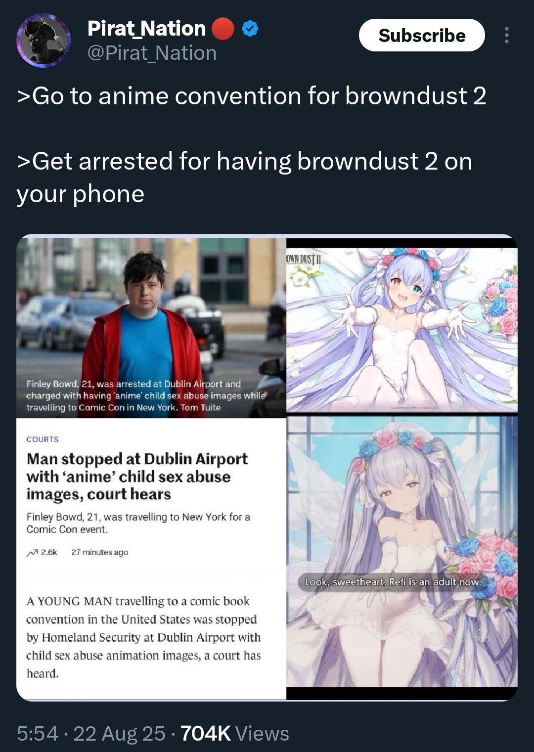 >>1555830They're entirely different things, even according to the law. It's typically different crime even in places where its illegal.>>1555833Do you have an actual source that says he was arrested for images of brown dust 2 gacha? or is that just a rumor?>>1555837Morally they are different as well.>>1555859why are people so paranoid about trannies? it's a mass delusion at this point.