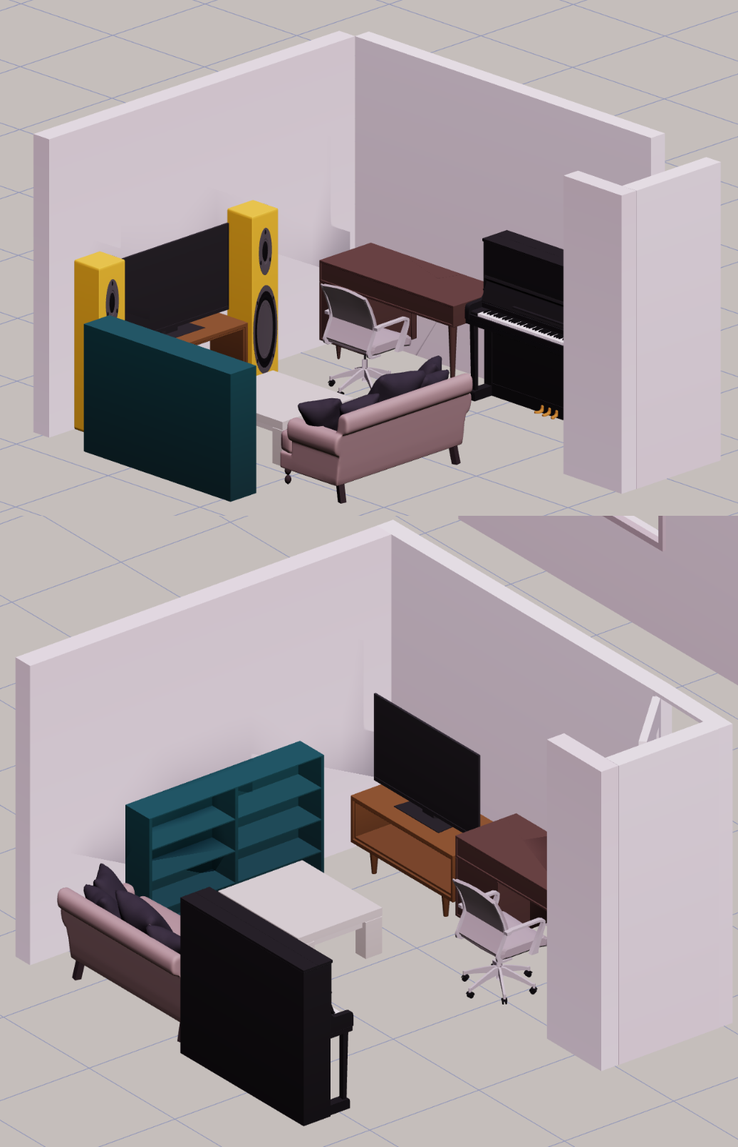 Not really sure where to post this. Considered /diy/ but it didn't seem right.I need some advice/critique on this room design. Example 1 is on top, Example 2 is on the bottom.What I'm hung up on is that the sofa on Example 1 does not feel right since its not against a wall. Same with the TV facing the entrance. Something about that feels unnatural.However on Example 2, the distance between the TV is a bit longer and leaves less room for speakers. There is also a window where the sofa is so sunlight could potentially hit the TV directly.