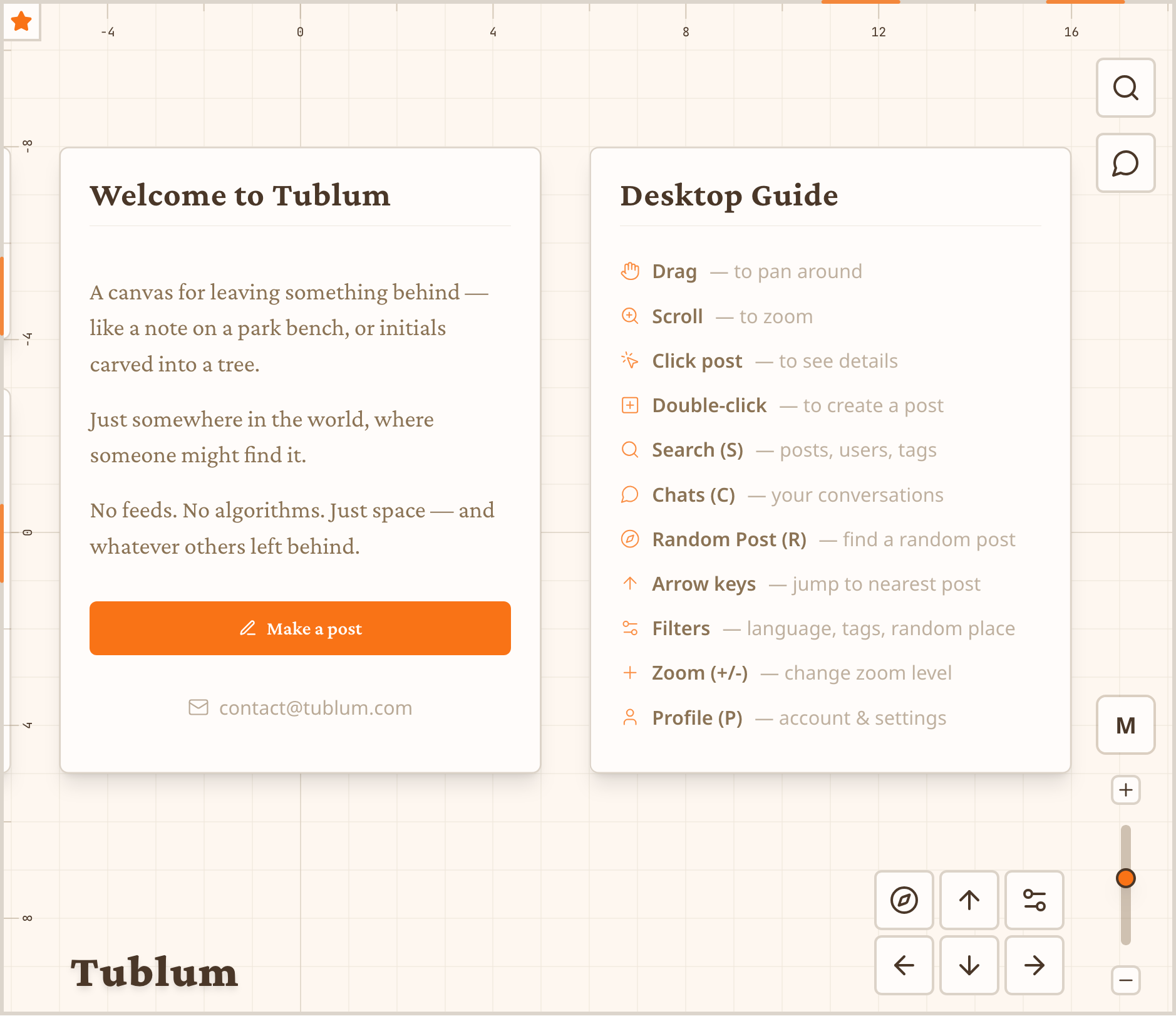 Infinite zoomable canvas where anyone can post. No feeds, no likes, no followers. You just scroll around and find what people left behind. I could use some feedback.