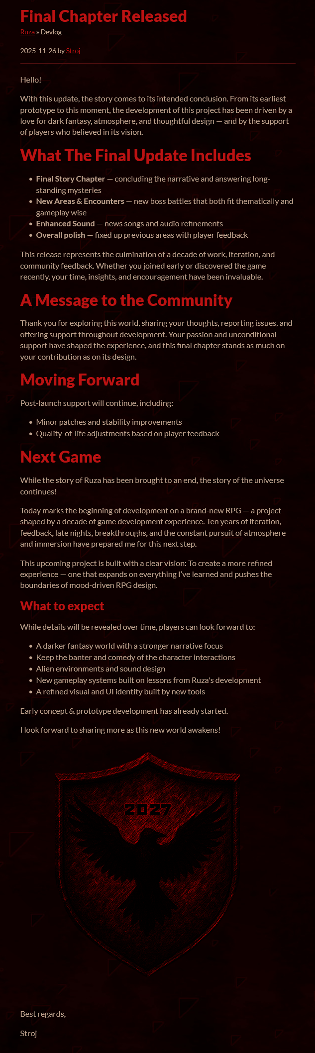 This was probably one of the most unique games made in RPG maker made by a westerner, at least by the overall look of it. Around 2025 Stroj, the developer of this game, gets brain damage and essentially goes insane, with the supposed help from some 'cord cult that groom him. First he sabotaged his game, cutting content from the 2 chapters that was already created and adding a "fuck you" type of ending where he rants about how his fanbase is disgusting and ends on MC ACKing himself. Later he seems to be starting getting normal again, and even add back all the dialogues and content he cut previously with the fixed 3 chapter, but eventually decide to completely erase his presence from the internet as well as this game. It was delisted from Steam and it's page was scrubbed off the itch.io, and since the game was a free project you couldn't even find it elsewhere. There around 3 version of this game worth preserving: pre 3 chapter version with unaltered 1-2 chapters version with original 3 chapterversion with fixed 3 chapter